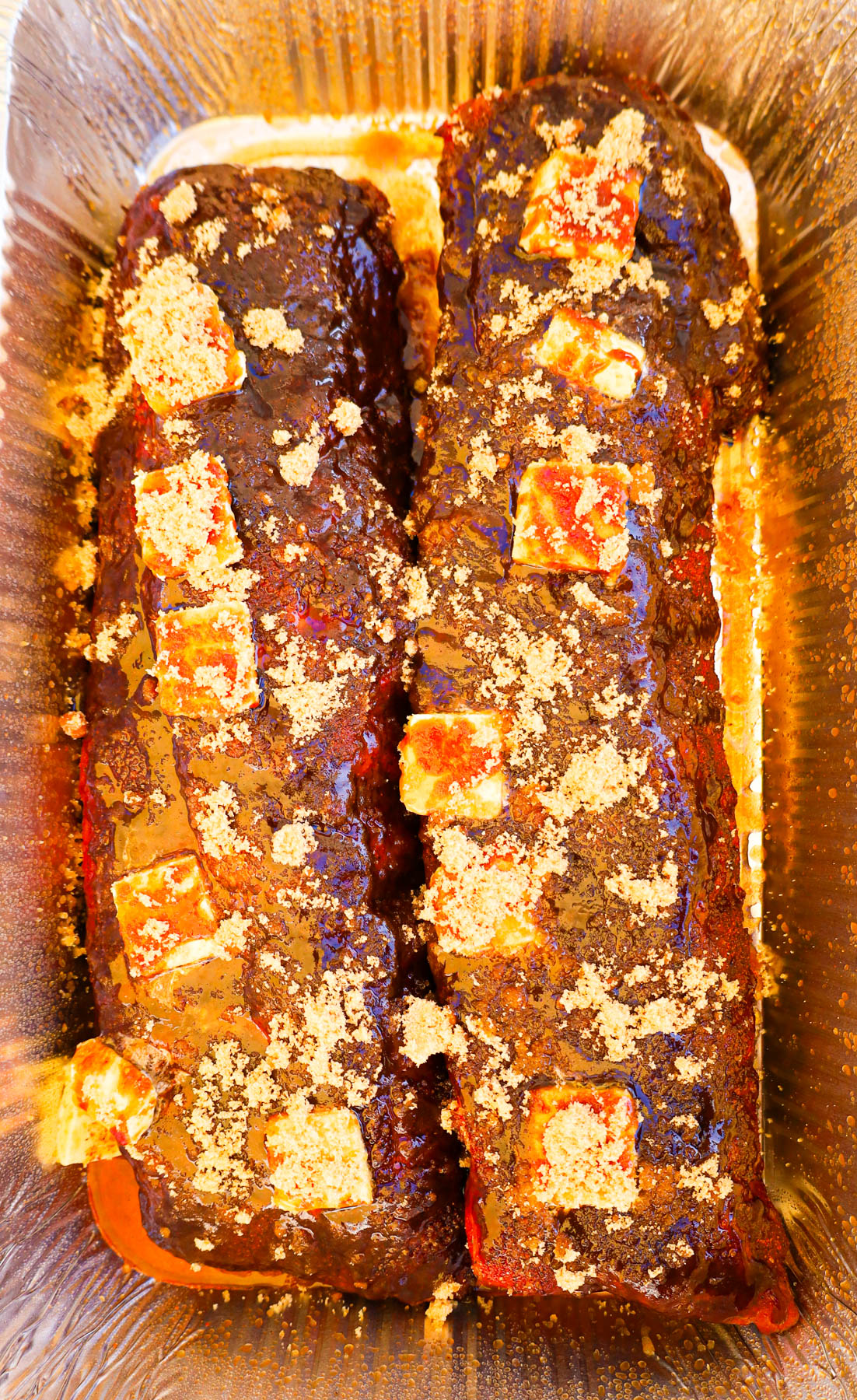 • Once temperature reaches 160°F, wrap the ribs in a covered foil pan and glaze with honey and brown sugar and raise the temperature to 225°F.